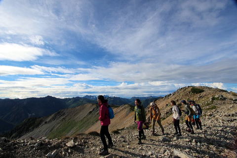 槍ヶ岳遠望、その右に見えているのは常念岳と蝶ヶ岳か。東北にかかり続ける前線と南から迫りくる台風、どこを見てもあまり天気が良くない中、今日は晴れてくれました。感謝