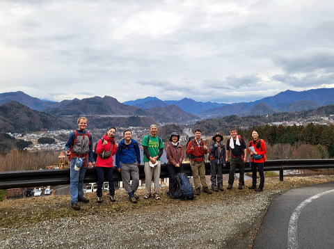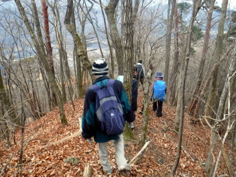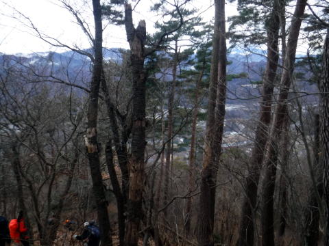 冬枯れの樹間を透かして町と向かい側の山並みが見えます。あれは三つ峠、そうしたらあれが本社ヶ丸・・・