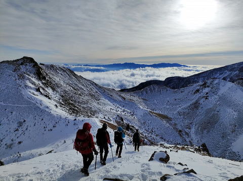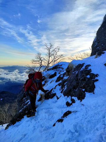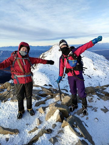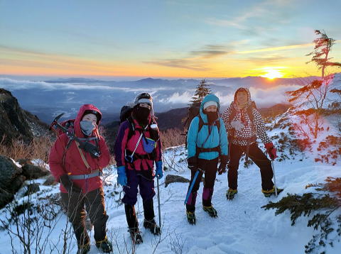 2日目、日の出前に出発し、朝焼けする橙色の山景色を眺めながら、天狗岳を目指し登頂。