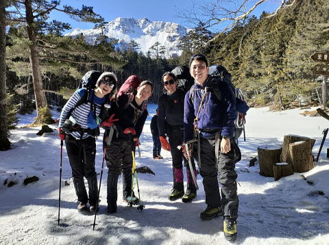 途中、しらびそ小屋横のミドリ池から、明日登る真っ白な天狗岳を見上げながら、みんなで日光浴。