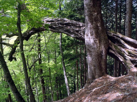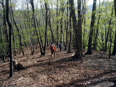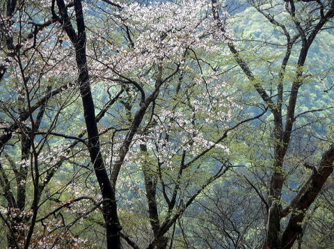 植林は控えめ。自然林は広がる。だんだんと濃い緑から黄緑色、木漏れ日と新緑、それと山桜が満開。