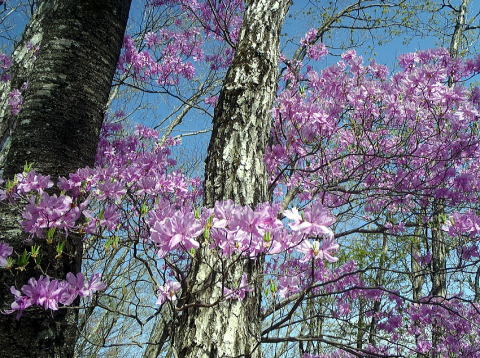 高度を下げるに連れ、冬枯れから新芽が芽吹き、若葉が目を出し、ツツジと共に一面の新緑になりました。