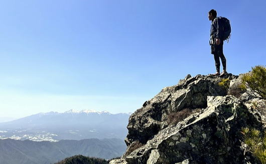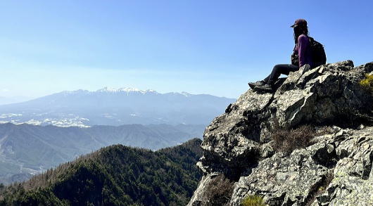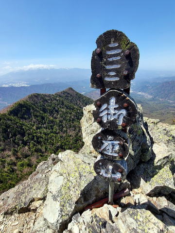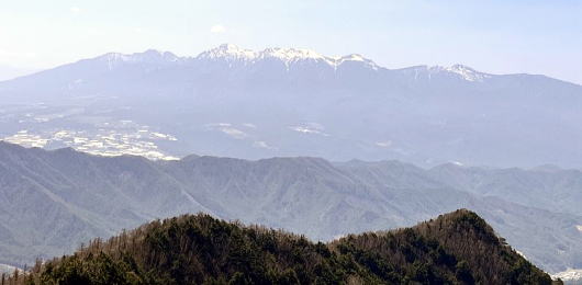 残雪の八ヶ岳、浅間山、両神山、そして金峰山や甲武信岳、春霞のせいで北アルプスは微かに見えるような見えないような…。その他にも色んな山々が見えました。