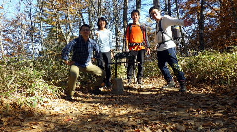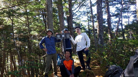 鞍掛山分岐から山頂までも一部緊張する箇所ありましたが無事に通過。山頂は展望ありませんが、記念写真だけパシャリ。