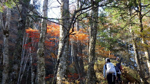 そこから先、日向八丁尾根の一部を歩いて鞍掛山へ。序盤から切れ落ちた細尾根が現れ、どうしようか悩みましたがメンバーに不安は無さそうだったので慎重に進むことにした。