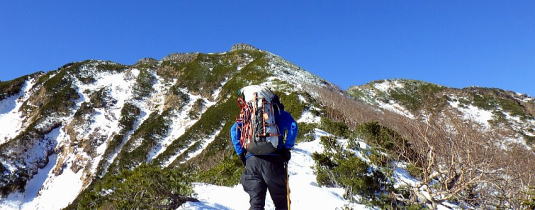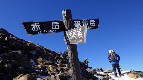 そこからも近そうで遠い三叉峰(さんしゃみね)までゼーゼーして登頂。主稜線を挟んで風上の西側斜面には雪が少なく風下の東側斜面には雪が多い、分かりやすい景色が広がります。