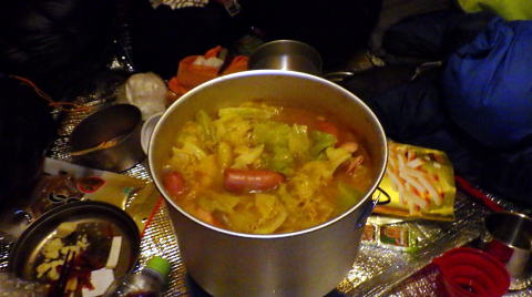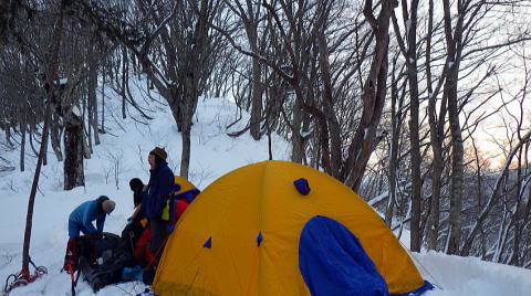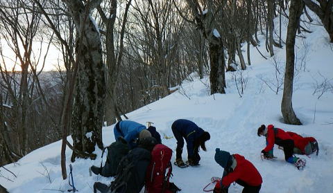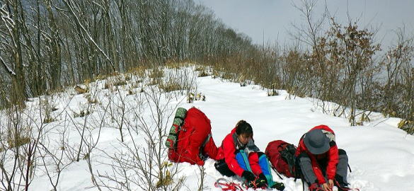 一日目のやや細い尾根では雪が少なく岩が滑ったため進むのに時間がかかりました。