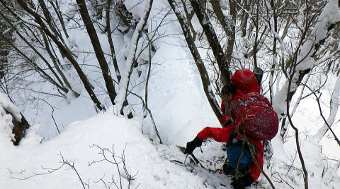 冬晴れの中、トレースのない新雪をラッセルしながら進み、時折木の幹近くの穴に埋もれながら歩きました。