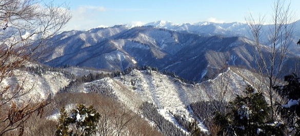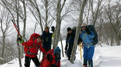 二日目は好天で気持ちよく歩けたけれど上に行くほど積雪深くラッセルは膝上、標高1350mまで頑張って登り、分岐から宝川林道へ向けて下りました。
