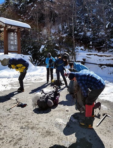 今回、ここで初めてアイゼンを装着するも、初心者はとにかく準備に時間がかかる。行動開始予定8:30を少し過ぎてようやく歩き始める。