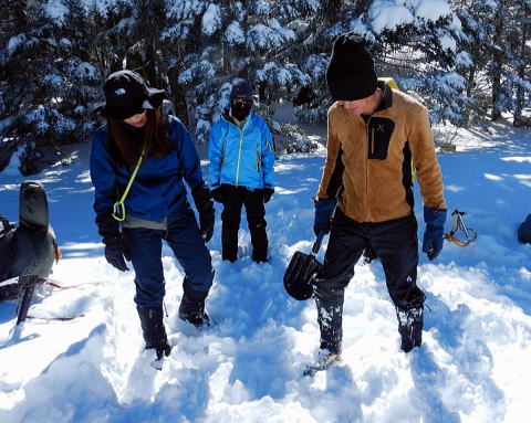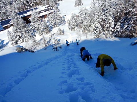 その後すぐ、ヒュッテ前の斜面でボスの指導で雪山講習。キックステップ、トラバース、ピッケルワークや下りの歩き方、尻セードからの滑落停止を教わる。