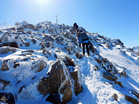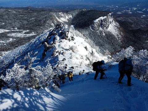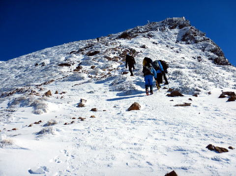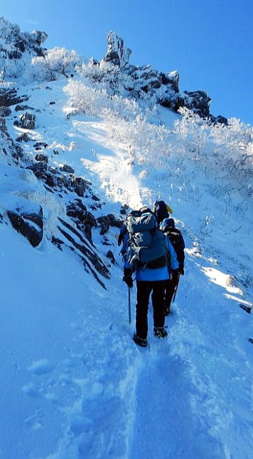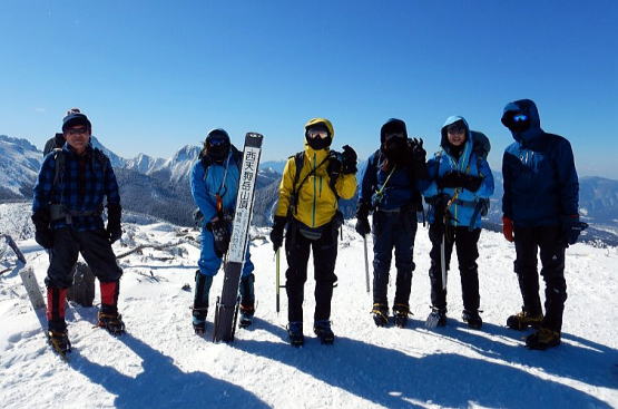 本日の行程は天狗岳を往復し、稲子湯に下山。ボスよりまさかの2日連続の先頭を任命され覚悟を決める。最初はいいペースで進むが稜線に出てからは登りも風も強まり、ゴーグルの中は必死の形相。ボスが道間違いに注意と言った矢先にルート誤り、落胆する。何とか9:30に東天狗岳(2,640m)に到着し記念撮影。見るだけで十分なのに、と分かってはいたが目前の西天狗岳(2,646m)まで歩を進める。強風で鼻と頬が強烈に痛い(後日、軽い凍傷に)。西天狗~分岐までは意外と早かったが、ヒュッテまでは遠かった。ヒュッテ到着後はテント撤収しパッキング。のんびりやっているつもりはないが初心者は時間がかかる。