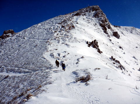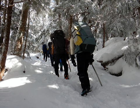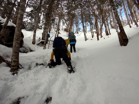 ボスより先頭を任命され、急に気が引き締まる。道はトレー スが十分あり、踏み抜くこともなく歩きやすいが、大きめの荷物 と使い慣れないピッケル操作、地味に続く登りで体力を消耗す る。