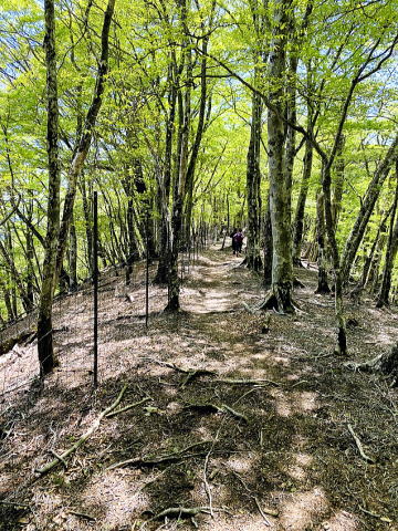 ブナ林の明るく風通しの良い尾根で、新緑の木漏れ日の中を気持ちよく歩くことができました。
