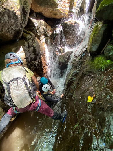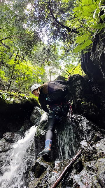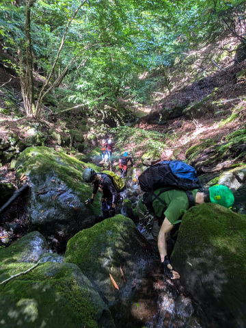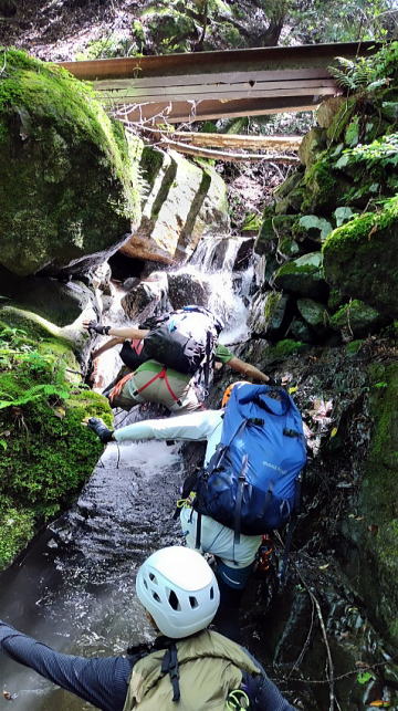 台風一過の快晴、心配した増水も濁りも問題なく、遡行を開始しました。逆に凡庸すぎてつまらないと怒られないか心配もしましたが、ときたま現れる2m前後の滝を登ったり、北側斜面らしい苔むした沢の様子を楽しんだりすることができました。泥が多く歩くと水がすぐに濁るのだけが残念でした。