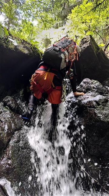 詰めは、沢とここまでは並走してきた登山道を使って尾根にあがることもできましたが、やはり沢をそのまま詰めることに。すぐに水枯れし、最後はいかにも沢の詰めらしいラック注意の急斜面を登りました。その途中、雷が聞こえるようになりました。天神山の山頂に出たところで土砂降りの雨。倉岳山をあきらめ、どうせ濡れるからと沢装備そのままに下山を開始しました。