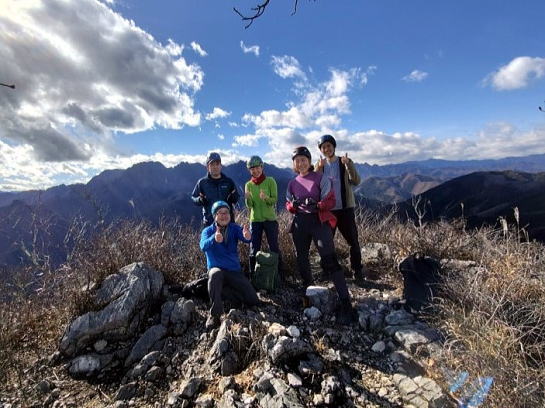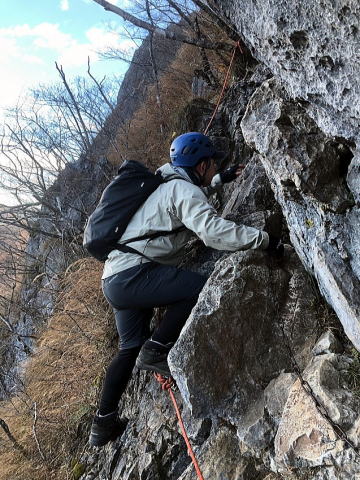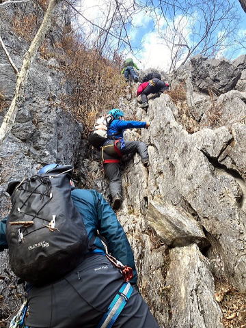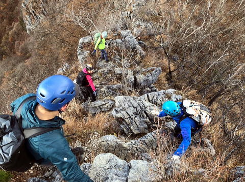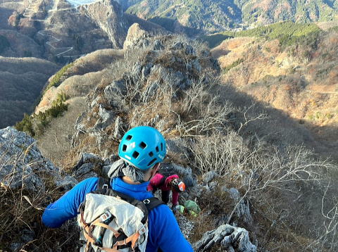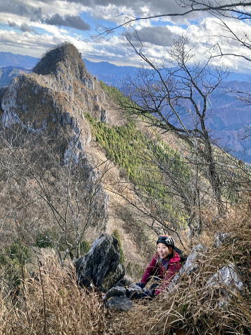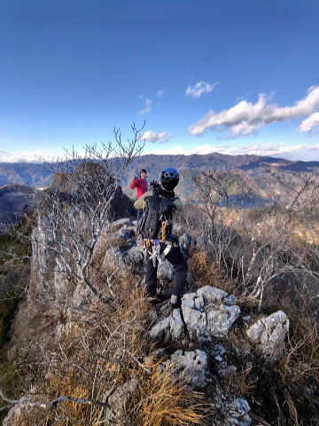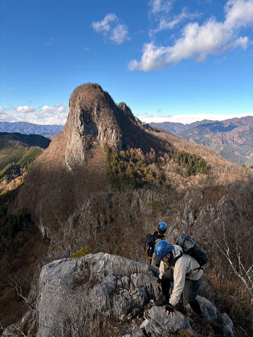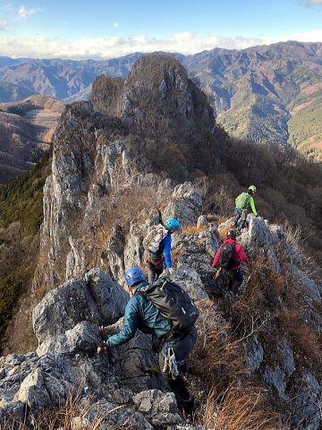 東岳と西岳の鞍部にある股峠を起点に東岳へ向かいます。途中、鎖のあるトラバース箇所が少しヒヤリとするのですが、皆さん難なく通過しました。岩の痩せ尾根を歩いて東岳山頂へ。目の前に両神山。紅葉は終わっていましたが山から伸びる尾根と谷の襞がくっきりと見えました。