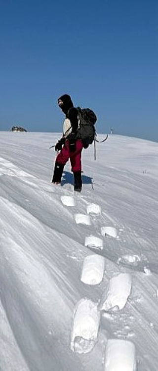 しかし、このあたりから風が強まり、寒さも増してきました。風が強く、体感温度もかなり低く感じましたが、前白根山の標識が見えた時はほっとしました。暴風の中、日光白根山を背景にグループ写真をとり、すぐ下山しました。
