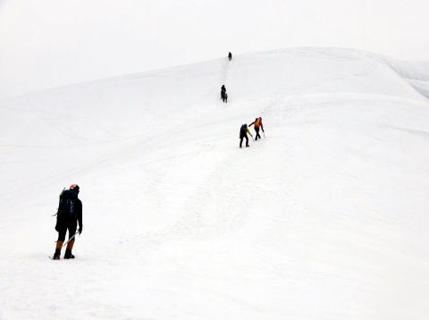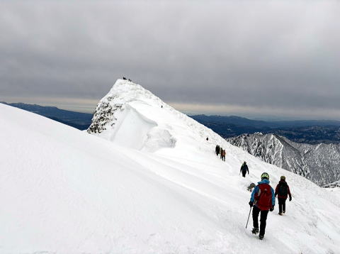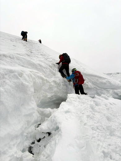 曇天ながらも雲が高く、360°マウンテンビューと美しく幻想的ですらある雪庇やクレバスがきつい急斜面に癒しとなりました。