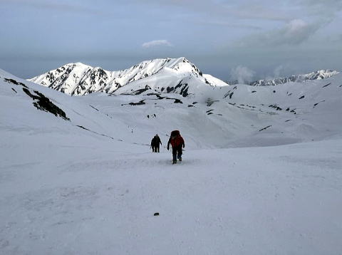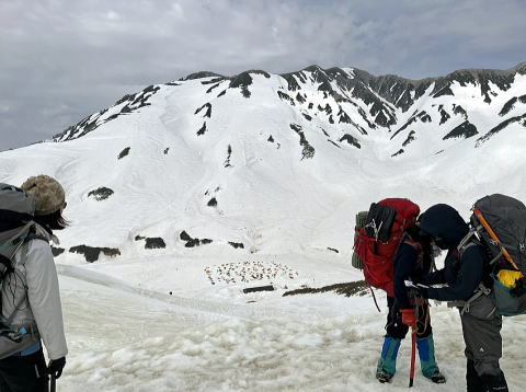 身支度、昼食を済ませ、雷鳥沢テン場まで移動。雪の状態は緩み歩きづらい。