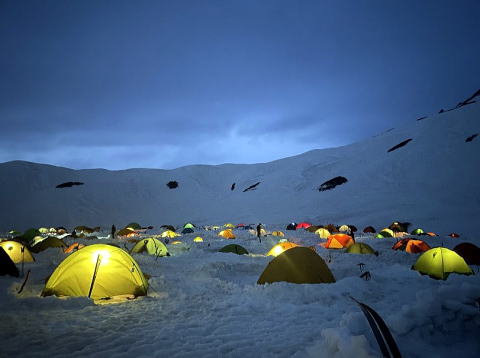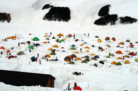 予想通り多くのテントで賑わう。夜半荒れ模様の予報が出ていた為、テントを念入りに張り、雪のブロック作る。