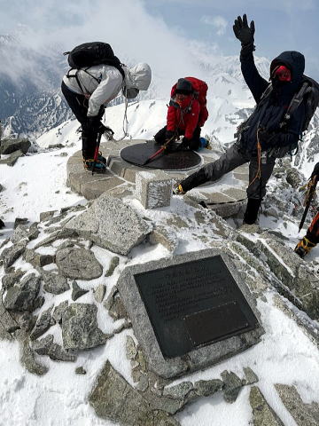 雄山までアイゼンを引っ掛けないよう慎重に登る。雄山に到着。剱岳も良く見える。風は少し収まってきていた。山頂から少し降りた所で写真撮影、行動食を摂る。大汝山までのルートを確認。次回は行ってみたい。