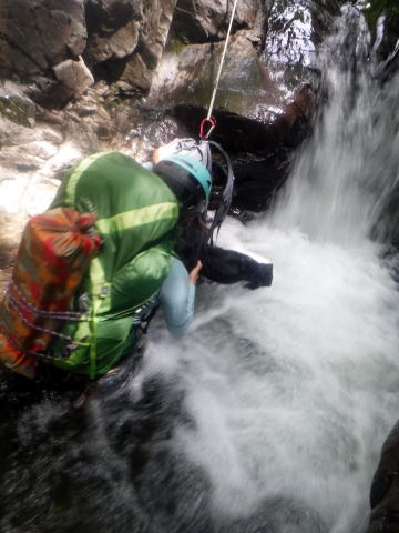 それでも、乗越の鞍部を目指す頃には時間も経過し疲れが出てきます。同時にナルミズ沢広河原側に下降する沢は奥多摩の様相と変わりません。段差では両岸の笹をしっかりと掴んで下りていきます。幕営地の広河原に着いたのは18時をまわっており、2張りの先着がありました。