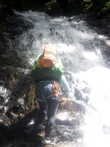 11:40分土合橋から東黒沢に入渓。谷は広々と開放的で、水は澄んでキラキラと光っています。両岸の緑の木々は濃く鮮やか、見上げれば真っ青な空、スラブ上の傾斜も緩やかで気持ちも弾みます。