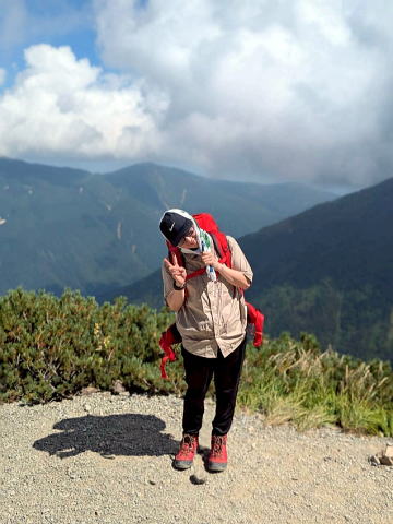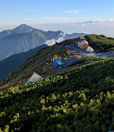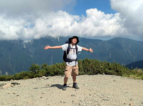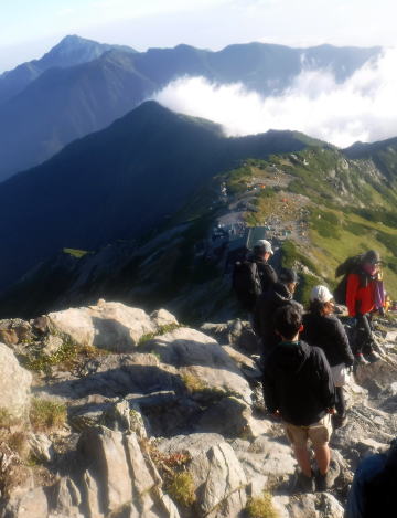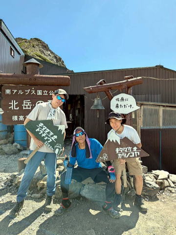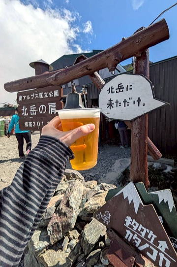 肩の小屋の手前にある岩場に心が折れそうになりましたが、眼前に広がる素晴らしい景色に癒され、なんとか到着。 小屋で記念撮影を済ませ、冷えたビールで喉を潤しました。