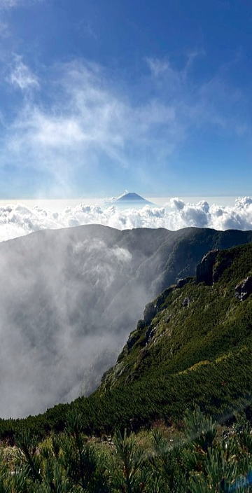 尾根に出ると、まるで空中にいるかのような開放的な景色が広がり、遠くには甲斐駒ヶ岳が堂々とそびえ立っていました。