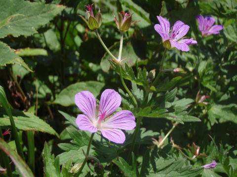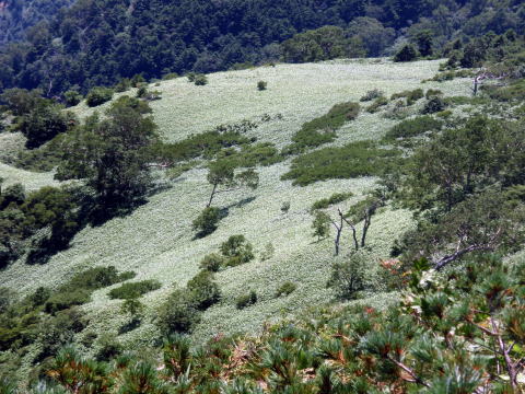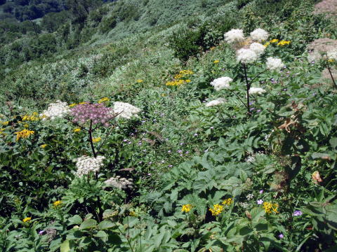 白砂山頂着、笹藪は山道から下がってお花畑です。シシウド、アキノキリンソウ、ハクサンフウロなどが咲いていました