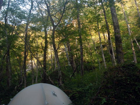 朝日を浴びながら小滝を越えます
