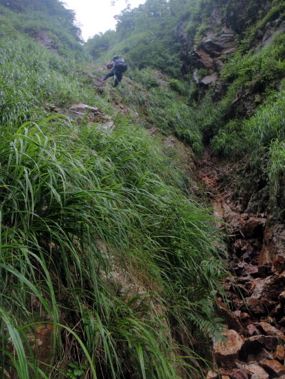 藪を漕いで下っている途中から雨が降り出し、ときどきバチバチと音を立ててザックをたたく強雨になりました
