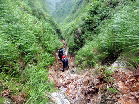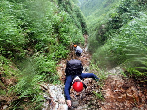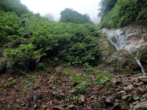 また滝に行き詰まって、懸垂の支点も取れず、きつい斜面の巻き下りから懸垂下降。まだ谷底ははるか下に見えていました