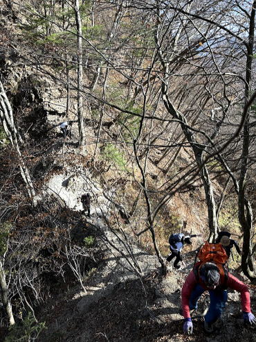 (※クラゴ山の尾根上まで、木につかまりながら登ります。枯れ木枯れ枝に注意、足元も落ち葉で滑ります。頑張れ)