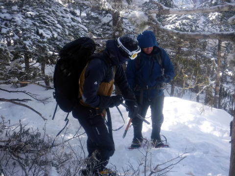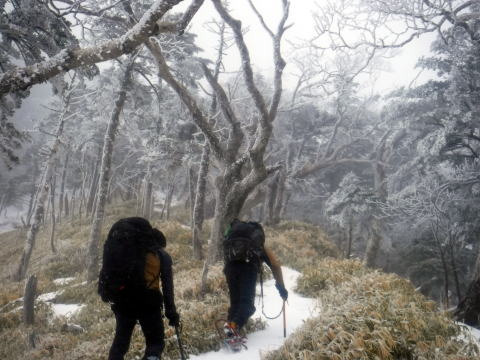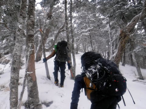 昨夜積もった雪もあり、1日目よりも雪は深かったため、ワカンを履いて三ッ頭を目指しました。