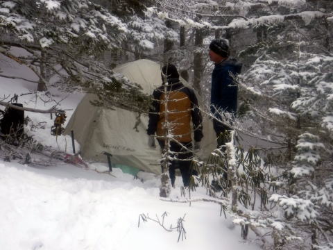 「これではテントが張れないね」と3人で会話をしながら前三ッ頭を少し越えた先の樹林帯でテントを貼りました(一日目はあいにくの天候で前三ッ頭から南アルプスの展望は見ることはできませんでした)