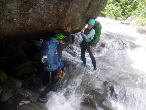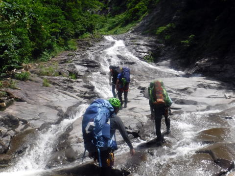 11:40分土合橋から東黒沢に入渓。谷は広々と開放的で、水は澄んでキラキラと光っています。両岸の緑の木々は濃く鮮やか、見上げれば真っ青な空、スラブ上の傾斜も緩やかで気持ちも弾みます。