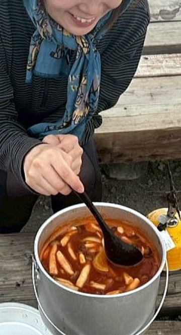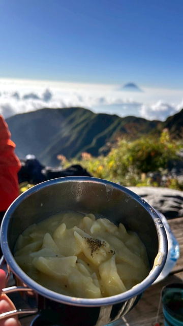 温かいクリームパスタとコーヒーが、冷えた身体と心に染み渡ります。 食事を終え、テントを撤収し、下山を開始しました。