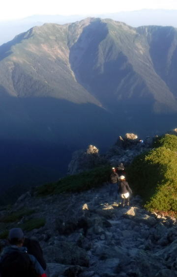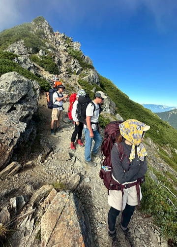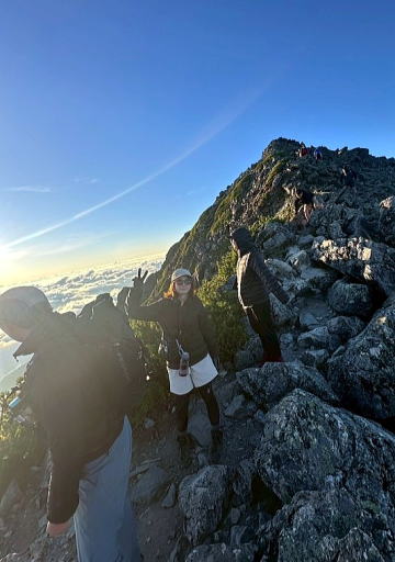 肩の小屋の手前にある岩場に心が折れそうになりましたが、眼前に広がる素晴らしい景色に癒され、なんとか到着。 小屋で記念撮影を済ませ、冷えたビールで喉を潤しました。