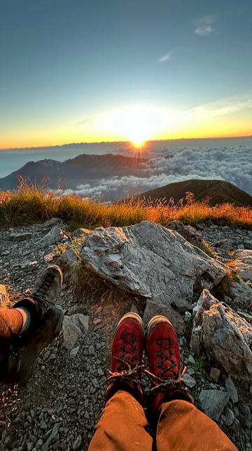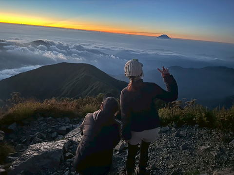 空が徐々に白み始め、眼下の雲海が幻想的な景色を作り出します。 午前5時過ぎ、ついに御来光が昇りました。 雲海と御来光、そして富士山が織りなす光景は、ただただ美しいの一言に尽きます。